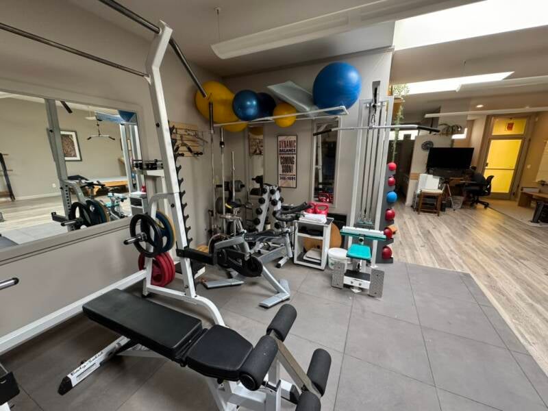 - Trainers this is a basic space with recumbent leg/arm erg, treadmill Concept II, spinbike rower, multiple cable stations, bands, balls, ropes, squat rack and full complement of free weights, balance bars, sticks, rollers, blocks etc. There is a 4x6 elevated table and large mats.